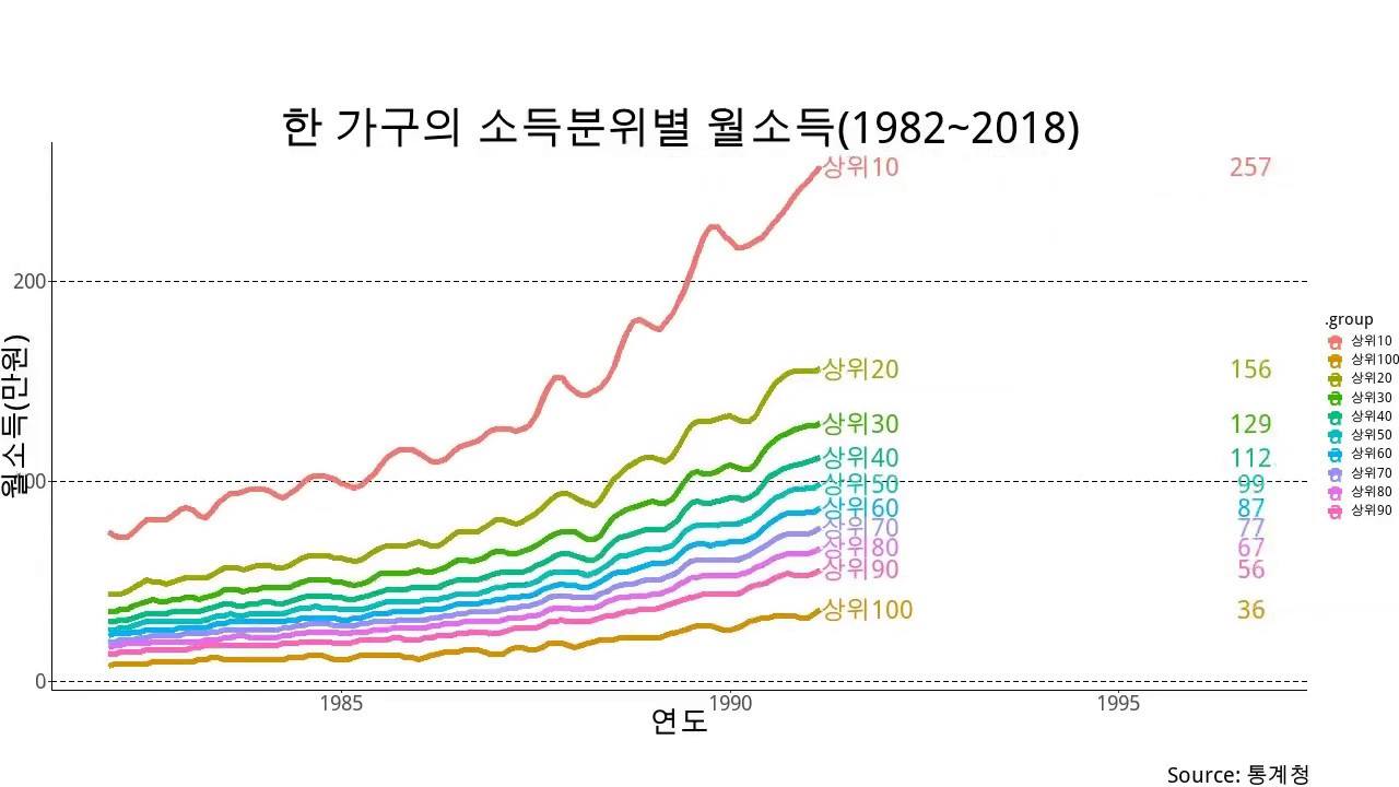 - 가구소득 10분위, 9분위 의 소득 성장률이 다른 모든 분위를 앞질렀음